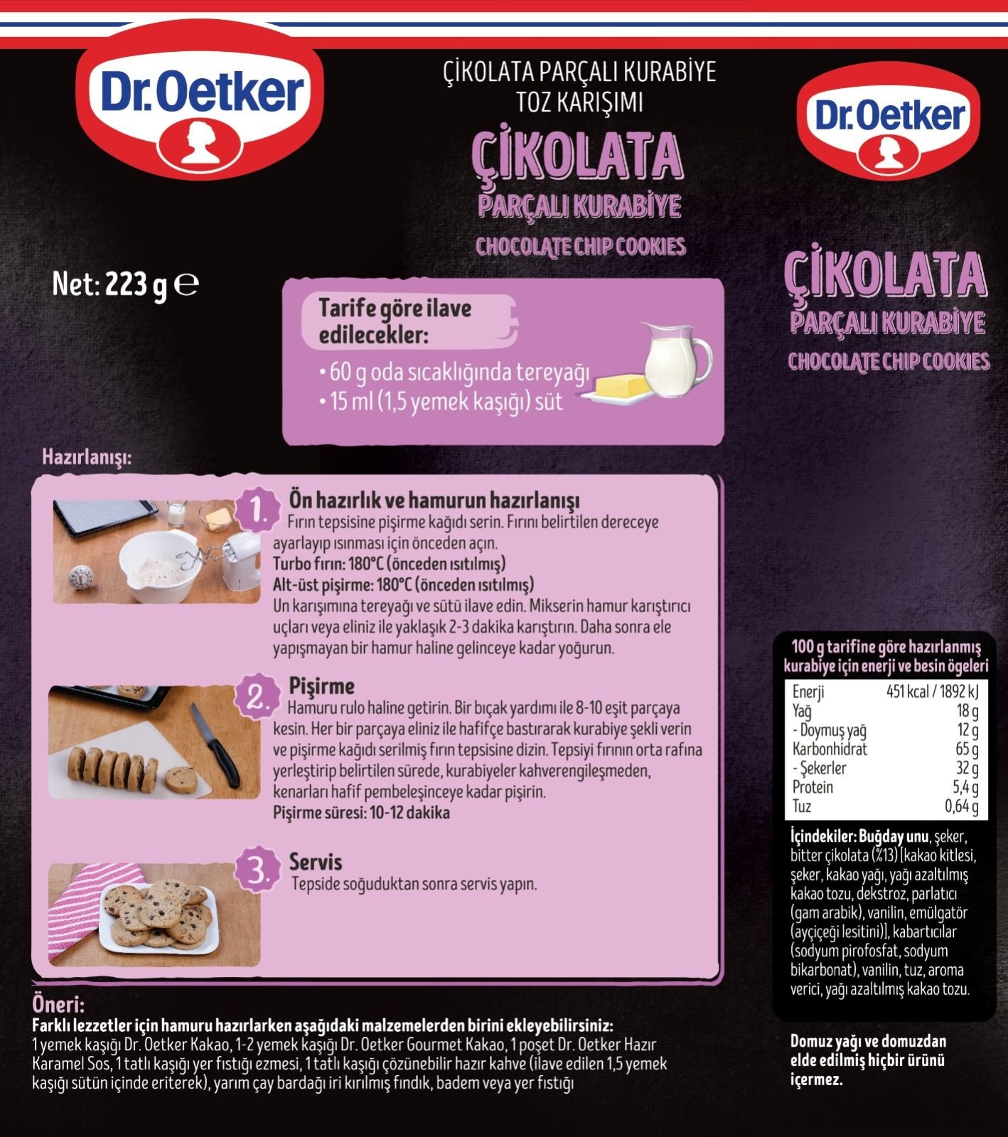 د.اوتكر خليط كيك كوكيز بالوكيز رقائق الشوكولاتة يمكن الآن تحضير كوكيز رقائق الشوكولاتة المفضلة عالميًا في 10 دقائق فقط! ستحتاج إلى الزبدة والحليب لهذا المنتج الذي يضمن الحصول على أشكال مثالية من 8-10 قطع من بسكويت الشوكولاتة المرة. لإضفاء نكهات مختلفة، يمكنك أيضًا إضافة عجين كاكاو دكتور أوتكر، كاكاو دكتور أوتكر جورميه، صلصة الكراميل أو زبدة الفول السوداني من دكتور أوتكر، القهوة سريعة التحضير، المكسرات، اللوز والفول السوداني. كما يمكن الوصول إلى فيديو التحضير من هواتفكم من خلال إظهار رمز QR الموجود على عبوات المنتجات.شوكولا Chocolate Chip Cookies World's favorite Chocolate Chip Cookies can be now prepared only in 10 minutes! You will need butter and milk for this product that ensures ideal forms of 8-10 bitter chocolate cookies. To create different tastes, you can also add its dough Dr. Oetker Cocoa, Dr. Oetker Gourmet Cocoa, Dr. Oetker Caramel Sauce or peanut butter, instant coffee, nuts, almonds and peanuts. It is also possible to reach the preparation video from your phones by showing the QR code on the products' packages.