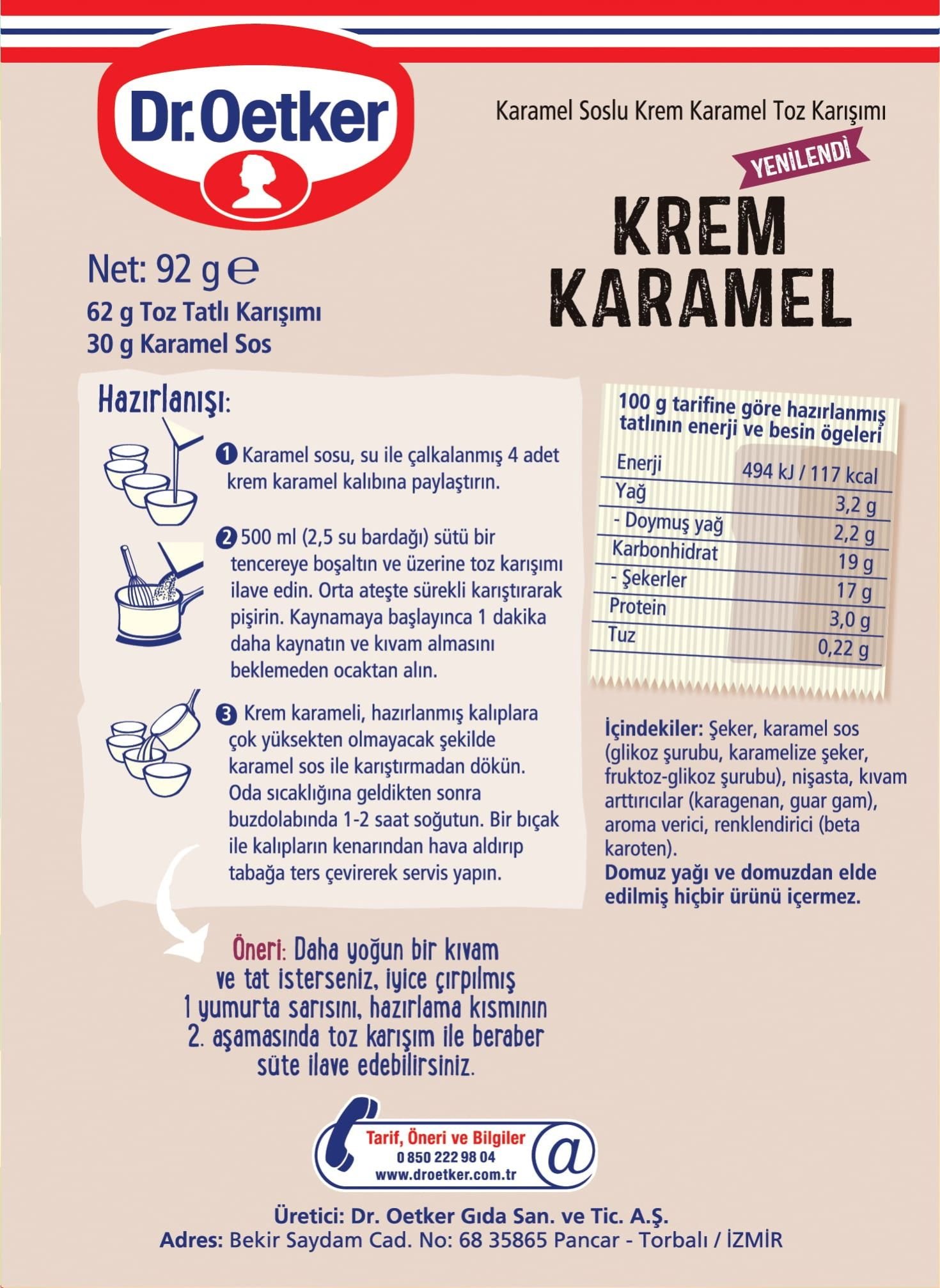 كريم كراميل لم يسبق لك أن تذوقته في مثل هذه الخفة من قبل! بينما يستغرق تحضيرها بالطرق التقليدية وقتاً طويلاً؛ الآن أصبح تحضير الكريم كراميل سهلاً للغاية بفضل دكتور أوتكر! تحتوي العبوات على صلصة الكراميل والكريمة الجاهزة للاستخدام والتي سيتم طهيها مع 500 مل من الحليب. Cream Caramel You have never tasted it as this light! While it takes a long time to prepare it with the traditional methods; now Cream Caramel becomes very easy to be prepared thanks to Dr. Oetker! Packages contain ready for use caramel sauce and cream that will be cooked with 500 ml of milk.