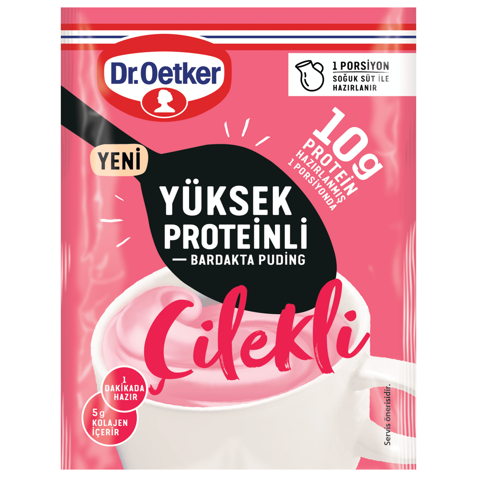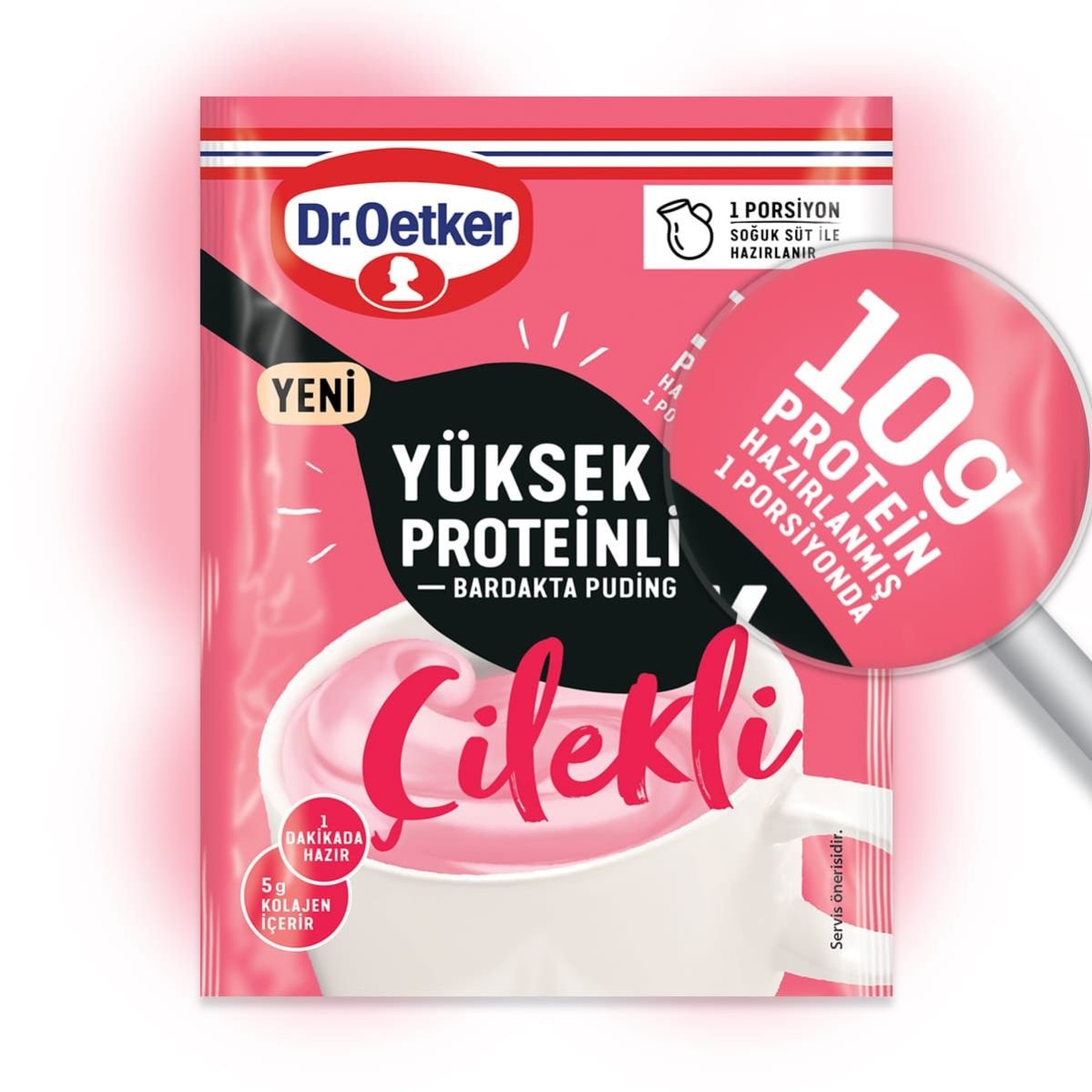 بودينغ الفراولة عالي البروتين في كوب يحتوي على 10 جرام من البروتين، وهو 20% من القيمة اليومية، و5 جرام من الكولاجين في حصة واحدة.
